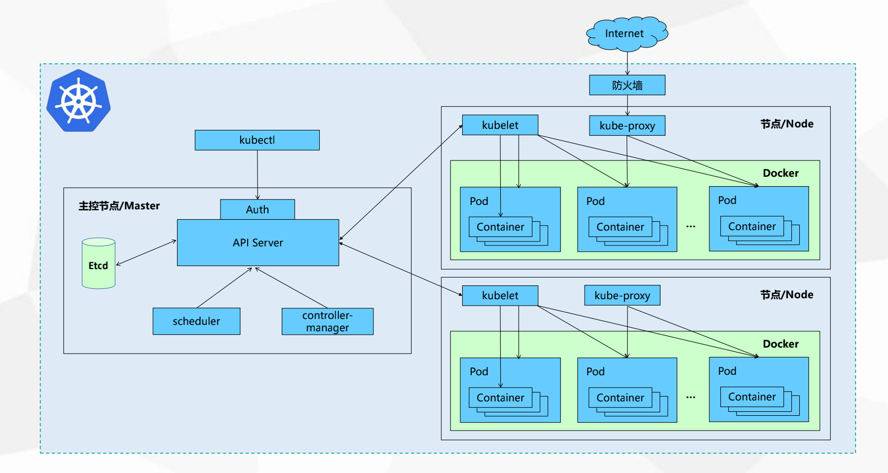Kubernetes API,集群的统一入口,各组件协调者,以RESTful API提供接口服务,所有对象资源的增删改查和监听操作都交给APIServer处理后再提交给Etcd存储。
